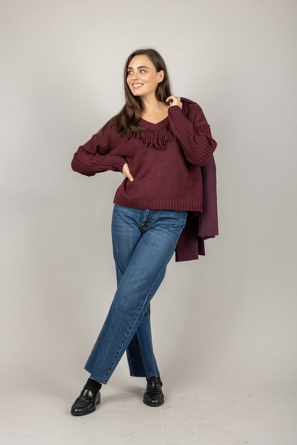 VICOLO - 77225F - MAGLIA SCOLLO A V CON FRANGE